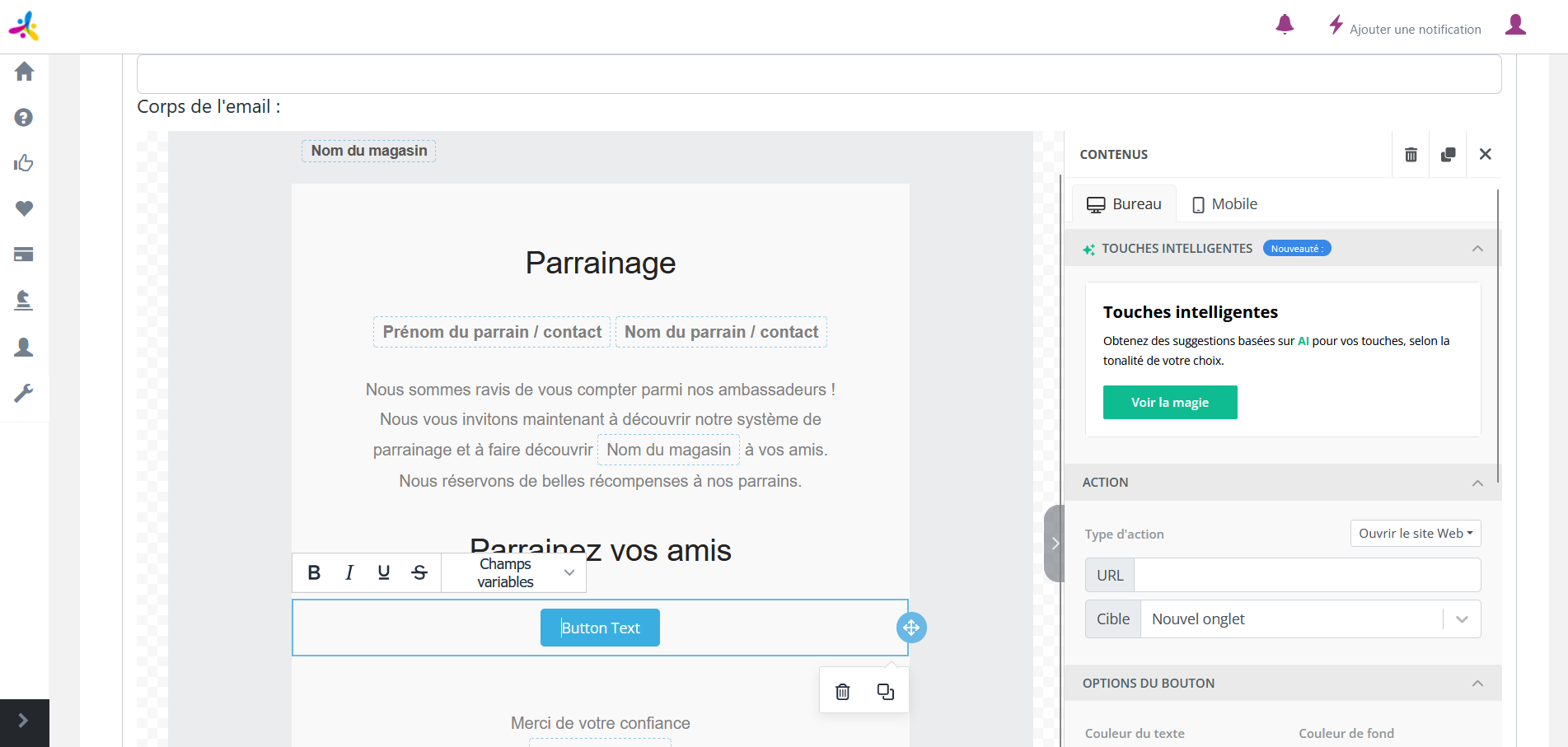Pour modifier la prévisualisation du message, vous pouvez en bas à gauche de l’éditeur de mail, cliquez sur l’icone de téléphone. Vous pourrez ensuite cliquer sur l’élément que vous souhaitez modifier.