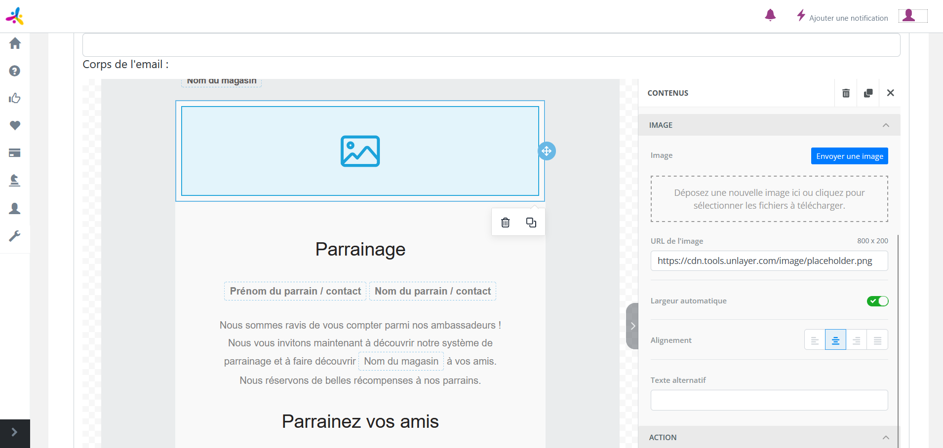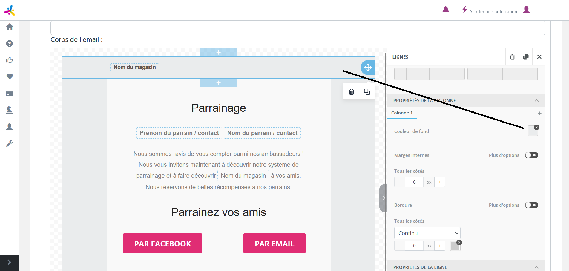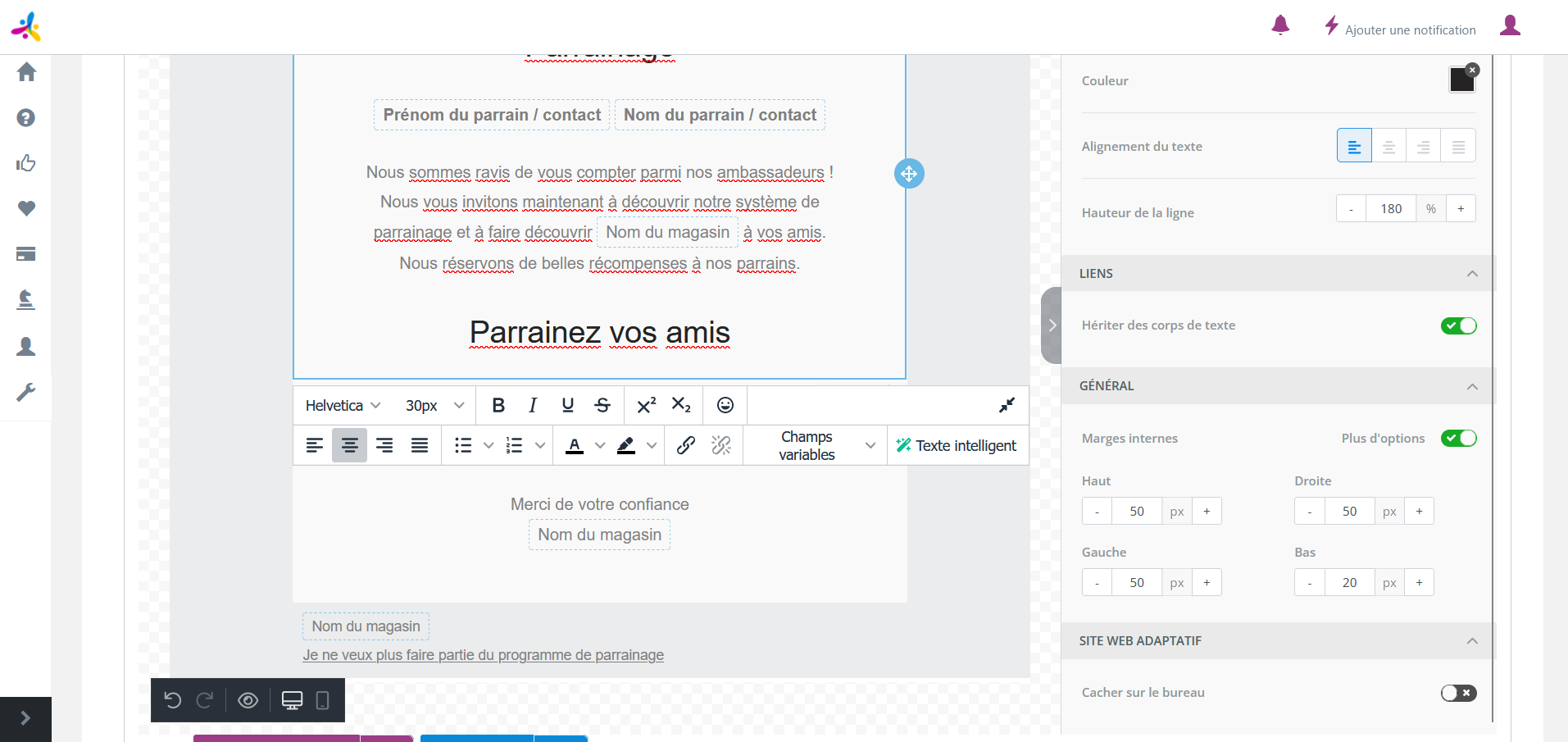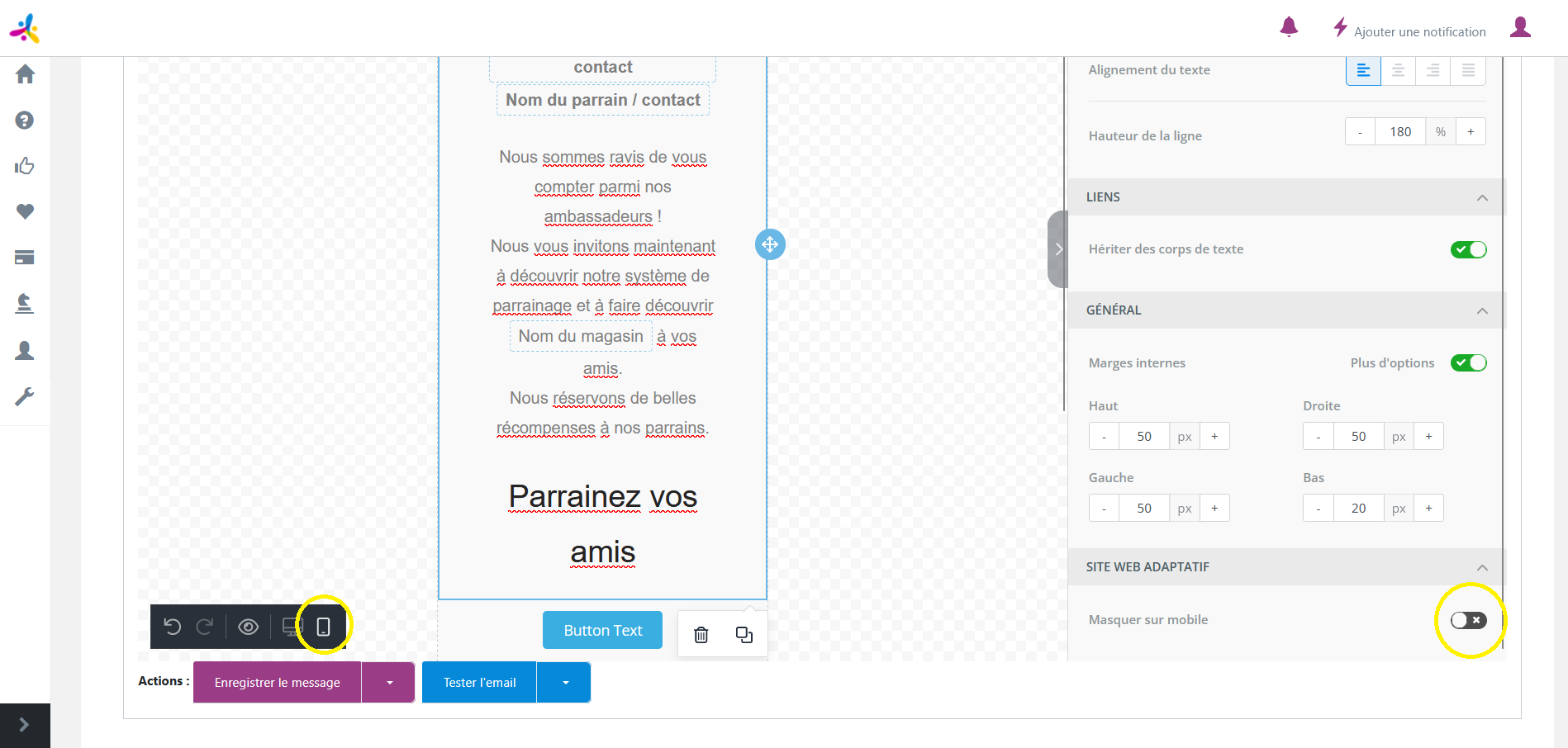Pour ajuster la position des éléments de votre mail, vous pouvez jouer avec les marges. Pour modifier les marges des éléments, il vous suffit de cliquer sur l’élément souhaité.